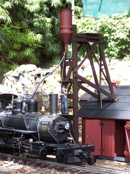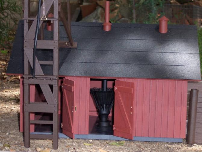 The sand tower features a brass sand hopper painted a rust color. The sand release lever actually moves, but does not actually dispense sand. Since the tower is the most fragile part of the group, it has been designed to be removeable from the sand house by removing two pins at the roof and lifting it off two additional pins placed in the ground. This allows one to remove the tower after an operating session without having to remove the sand house and sand bin.